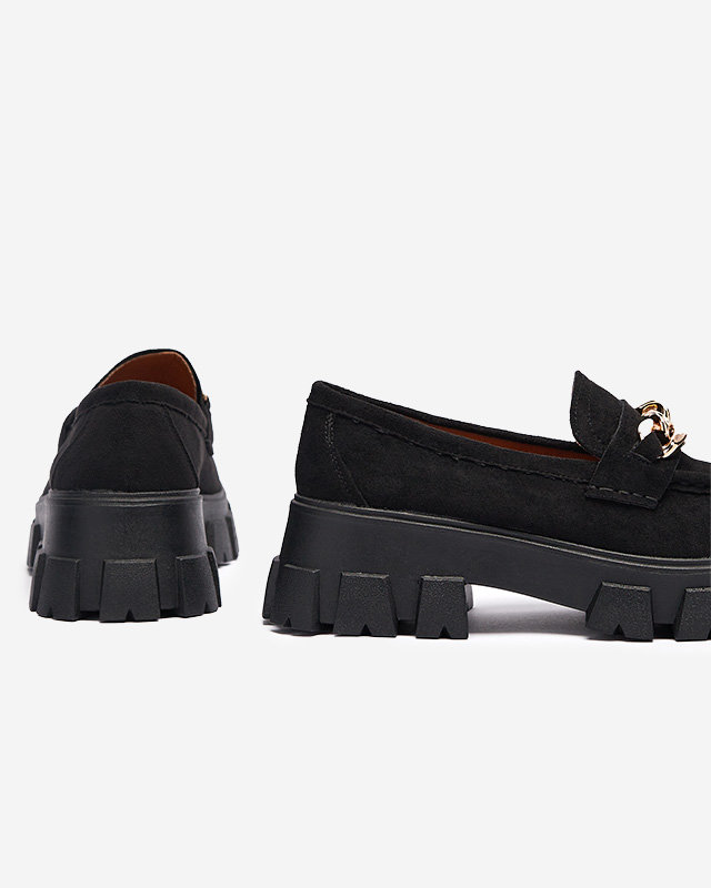 • Stylischer Damenschuh aus ökologischem Veloursleder. Innensohle aus Naturleder. Das Modell auf einer dicken Sohle hat eine goldene Verzierung auf dem Obermaterial. Eine wirkungsvolle Ergänzung zu vielen Styles!
