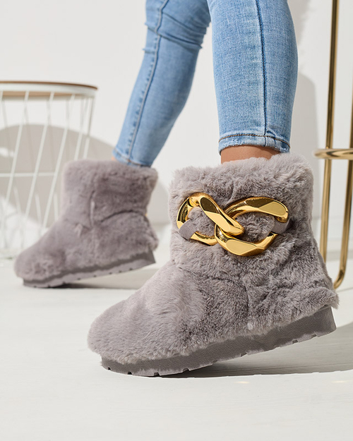 - Stylische Damen-Schneestiefel mit flacher Sohle. Modell ganz aus synthetischem Material a'a Pelz gemacht. Das Innere ist auch mit Pelz isoliert. Auf der Seite der goldenen Dekoration. Ideal für Winterspaziergänge! GRAU FRAUEN ISOLIERT SCHNEESTIEFEL SATTOP