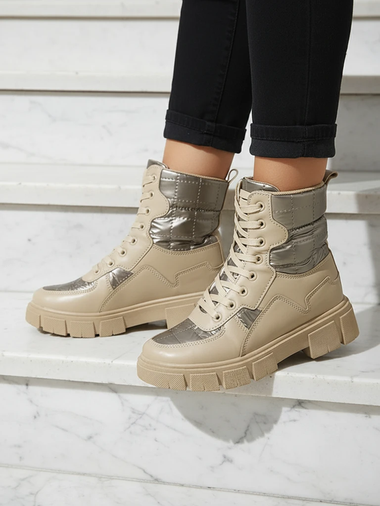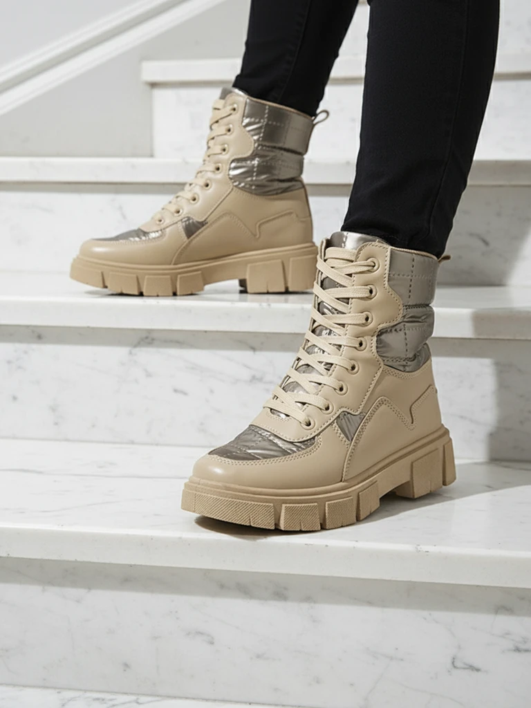 - Ausgezeichnete Damen-Schnürstiefeletten im Worker-Stil. Das Obermaterial besteht aus einer Kombination aus ökologischem Leder und einem kunststoffähnlichen Material mit gestepptem Finish. Das Innere ist mit Stoff ausgekleidet.