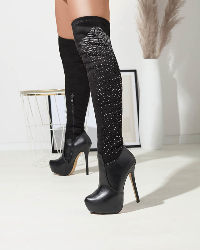 • Elegante Stiletto- und Plateaustiefel aus Öko-Leder und Öko-Wildleder. Die Innensohle ist aus Fell. Over-the-Knee-Modell mit runder Nase, mit Reißverschluss bis zur Mitte der Wade. Der Schaft ist mit Zirkonen verziert. SCHWARZE DAMENSTIEFEL STIEFEL AGIOCI