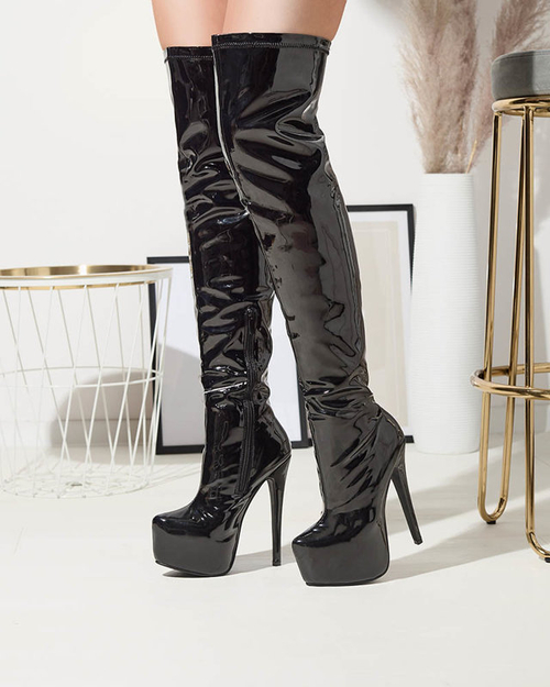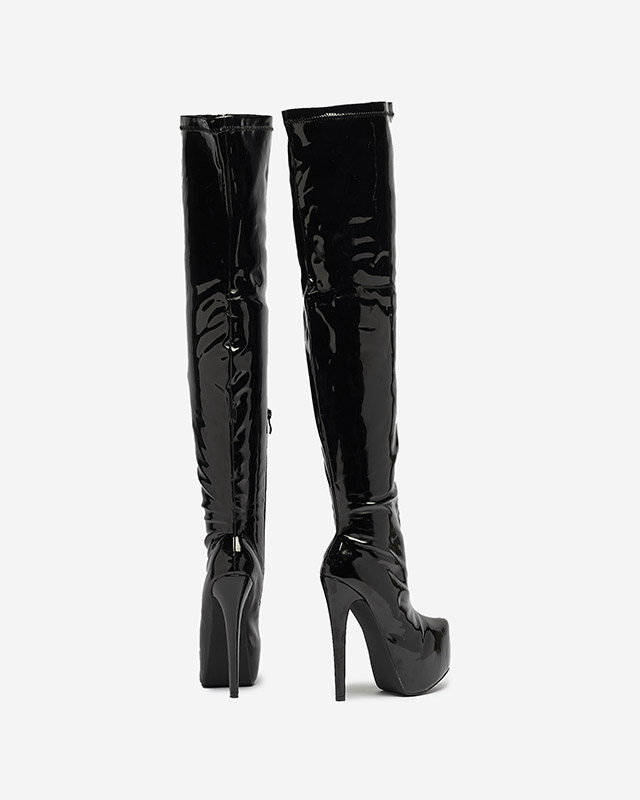 - Elegante Stiletto- und Plateaustiefel aus lackiertem Öko-Leder. Innensohle aus Öko-Leder. Die Mitte ist mit weichem Fell gefüllt. Über-Knie-Modell, mit Reißverschluss in der Mitte der Wade. SCHWARZ DAMEN STIEFEL STIEFEL LECCIE