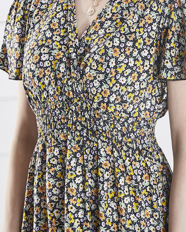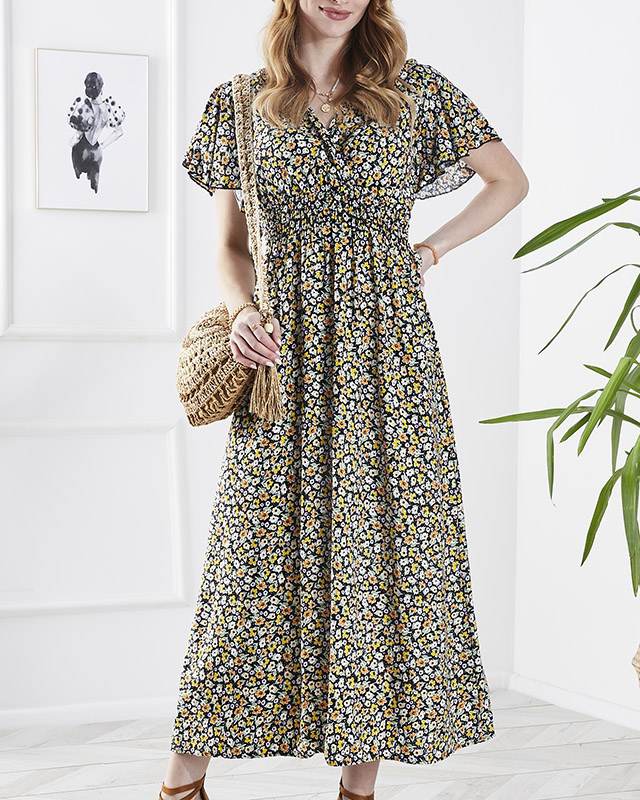 - Leichtes Damenkleid aus Stoff mit Blumenmuster. Das Modell mit Umschlagausschnitt, hat einen elastischen Bund oder kurze Ärmel. Perfekt mit Sandalen! HINWEIS: Messgenauigkeit (+/-) 1 cm.