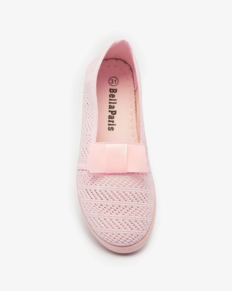 - Schöne Mädchen-Sneakers zum Hineinschlüpfen. Das Obermaterial ist aus durchbrochenem Stoffmaterial, die Innensohle ist ebenfalls aus Stoff. Das Paar ist mit einer niedlichen Schleife auf der Vorderseite verziert. Außerdem haben die Schuhe einen Gummieinsa