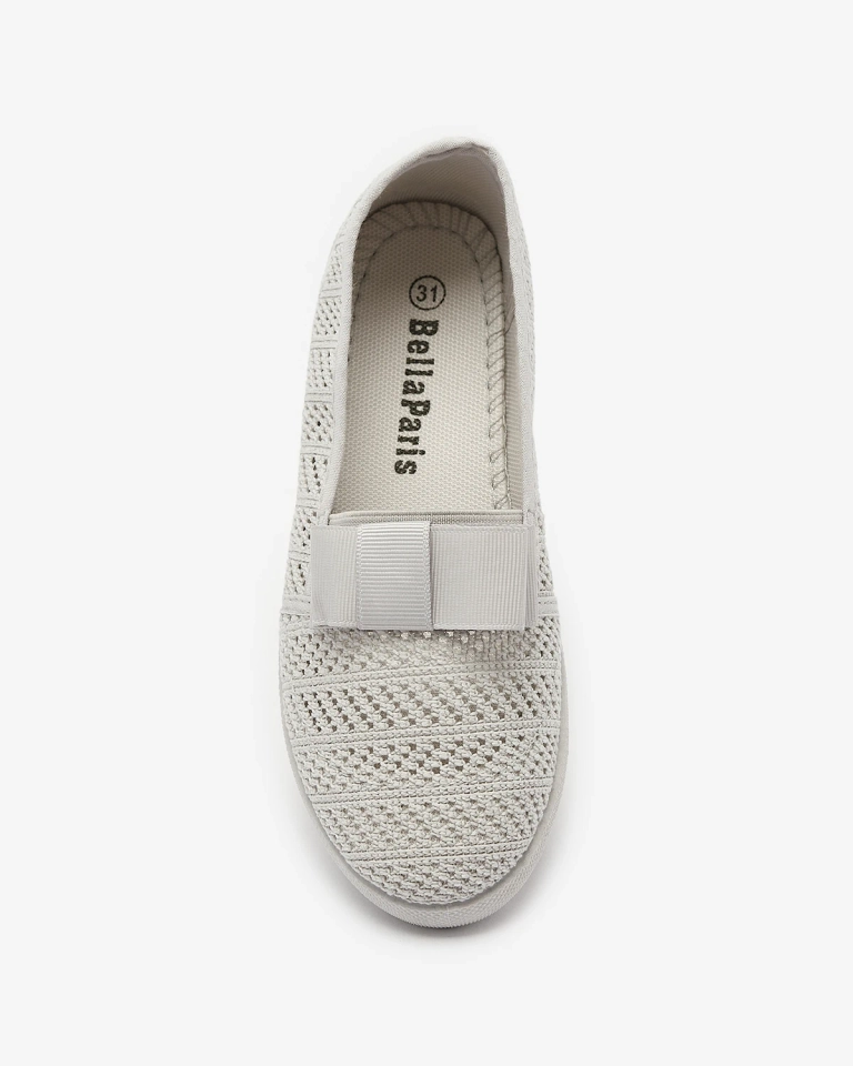 - Schöne Mädchen-Sneakers zum Hineinschlüpfen. Das Obermaterial ist aus durchbrochenem Stoffmaterial, die Innensohle ist ebenfalls aus Stoff. Das Paar ist mit einer niedlichen Schleife auf der Vorderseite verziert. Außerdem haben die Schuhe einen Gummieinsa