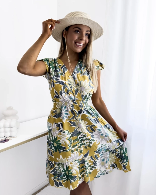 Senfgelbes Damen-Minikleid mit Blumendruck - Kleidung
