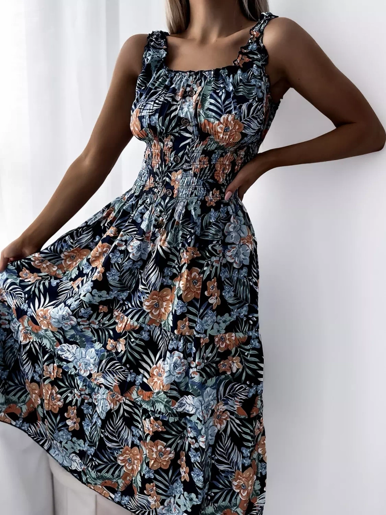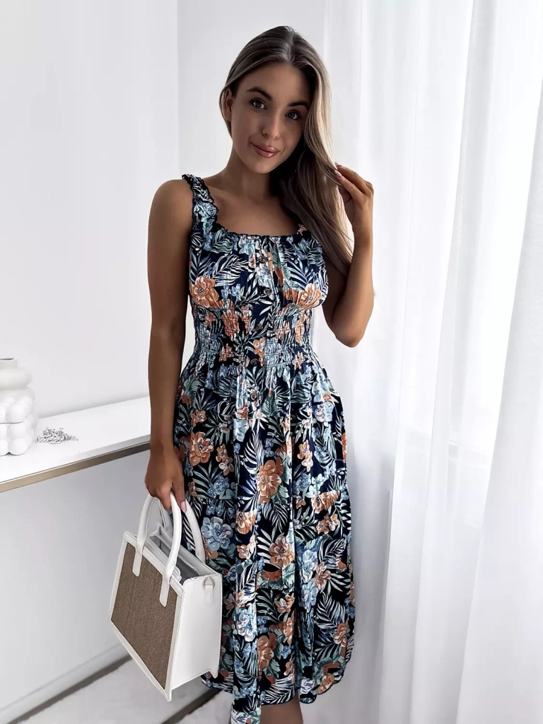 Marineblaues knielanges Damenkleid mit Blumenmuster- Kleidung
