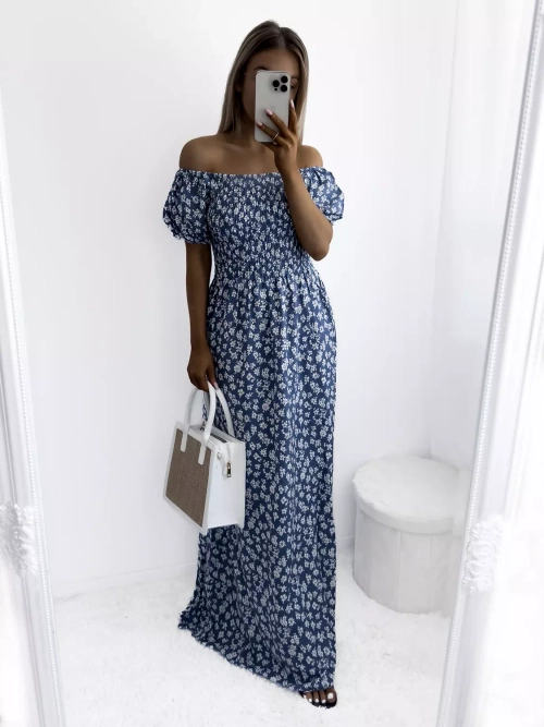 - Tolles, langes Damenkleid aus leichtem Stoff, das mit einem Blumenmuster verziert ist. Das Modell mit Rundhalsausschnitt a'la hiszpanka, hat kurze Ärmel und einen Gummizug an der Weite der Brust und Taille. Ein Muss in dieser Saison! HINWEIS: Messgenauigk