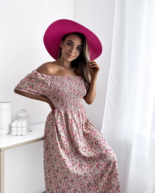 - Damen-Midikleid in Midilänge aus Baumwollstoff. Das Modell ist mit einem floralen Druck verziert. Es hat kurze Ärmel, einen Gummizug an den Schultern sowie an Brust und Taille. Eine ideale Wahl für das tägliche Tragen!