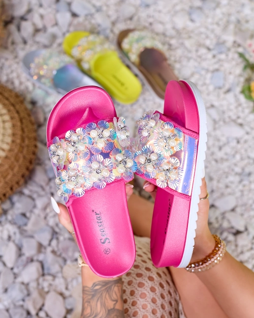 - Flip-Flops aus Gummi mit Blumen und Perlen sind die perfekte Kombination aus Komfort und Stil. Das Obermaterial ist aus Kunststoff mit holografischem Finish, die Innensohle und die Sohle sind aus Gummi. Sie sind sowohl für den Strand als auch für einen Sp