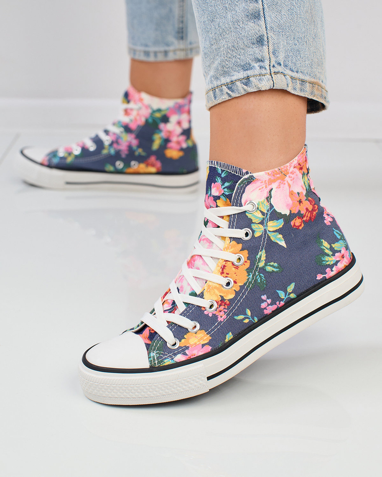 - Damen hohe Sneakers aus Stoffmaterial auf einer Gummisohle. Sie werden geschnürt und bieten eine perfekte Passform. Verziert mit einem Blumendruck verleihen sie Charme und Sommercharakter. Perfekt für das tägliche Styling!