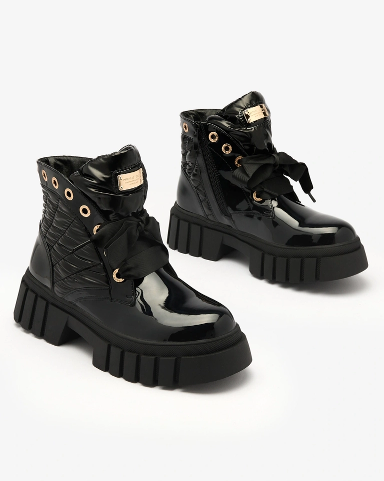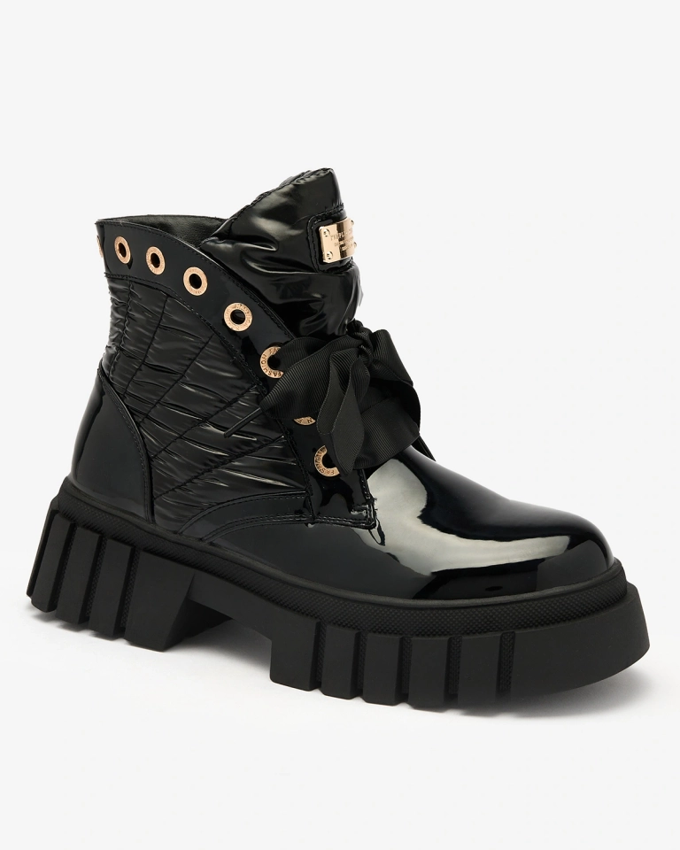 - Stylische Damenstiefel auf einer dickeren Sohle, gestepptes Obermaterial aus einer Kombination aus öko-lackiertem Leder und a'la Wachstuchmaterial. Die Mitte ist mit weichem Fell gefüllt. Modell zum Schnüren und mit Reißverschluss. SCHWARZER DAMENSTIEFEL