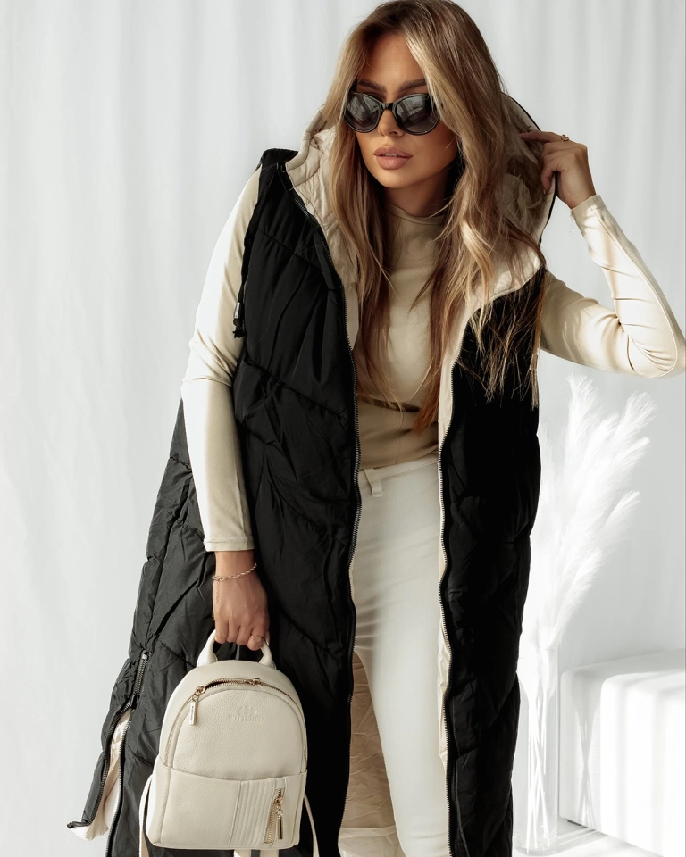 - Super stylische lange doppelseitige Damenweste mit Steppbesatz - perfekt für die Herbstsaison. Ärmellos mit Reißverschluss, hat eine Kapuze, vier Einschubtaschen. Das lässige Modell hat Schlitze an den Seiten, die mit Reißverschlüssen geschlossen werden.