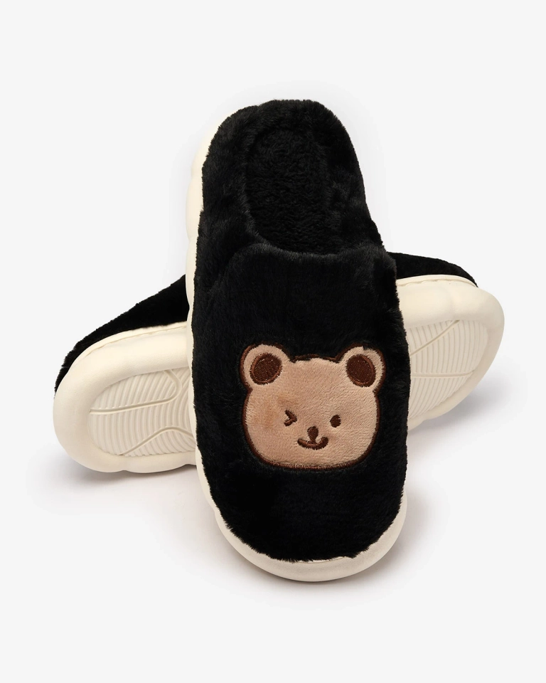 Royalfashion Schwarze Damen-Pelzpantoffeln mit Teddybär Hettres