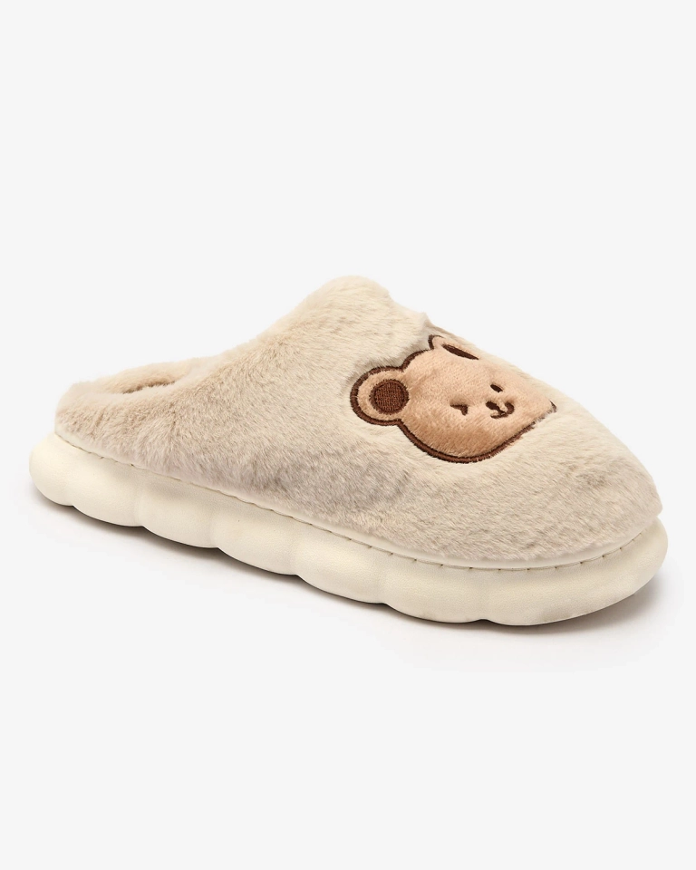 - Einzigartige Damen-Pantoffeln mit flacher Sohle, verziert mit einem Teddybär-Patch. Das Modell ist aus pelzimitierendem Material hergestellt. Eine tolle Option für Ihr Outfit zu Hause!