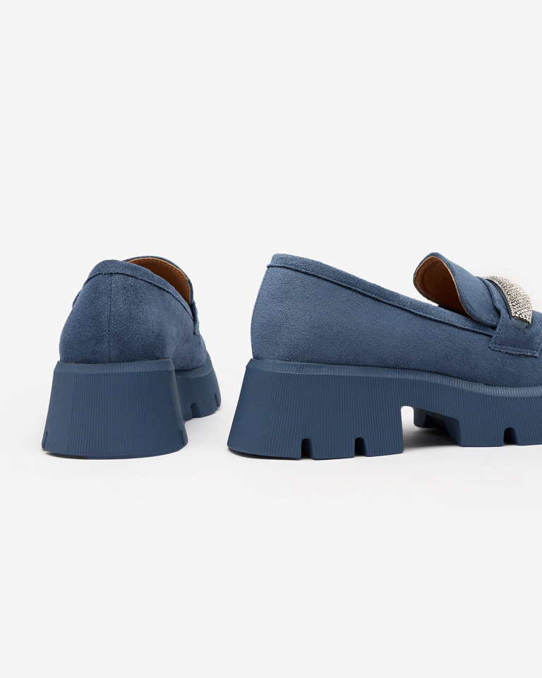 - Stylische Damen Mokassins mit dickerer Sohle, aus Öko-Wildleder und Öko-Leder-Innensohle. Auf dem Schaft ein Kunststoffornament mit Zirkonen. Perfekte Ergänzung zum Alltagsoutfit!