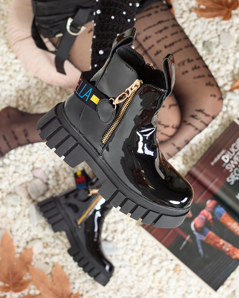 - Stylische Stiefel auf einer dickeren Sohle aus Lackleder. Abgerundete Nase, Mitte mit Pelz gefüllt. Die Schuhe werden mit einem Reißverschluss geschlossen. Das Modell hat einen dekorativen Reißverschluss und einen abnehmbaren Riemen. Tolle Schuhe für eleg