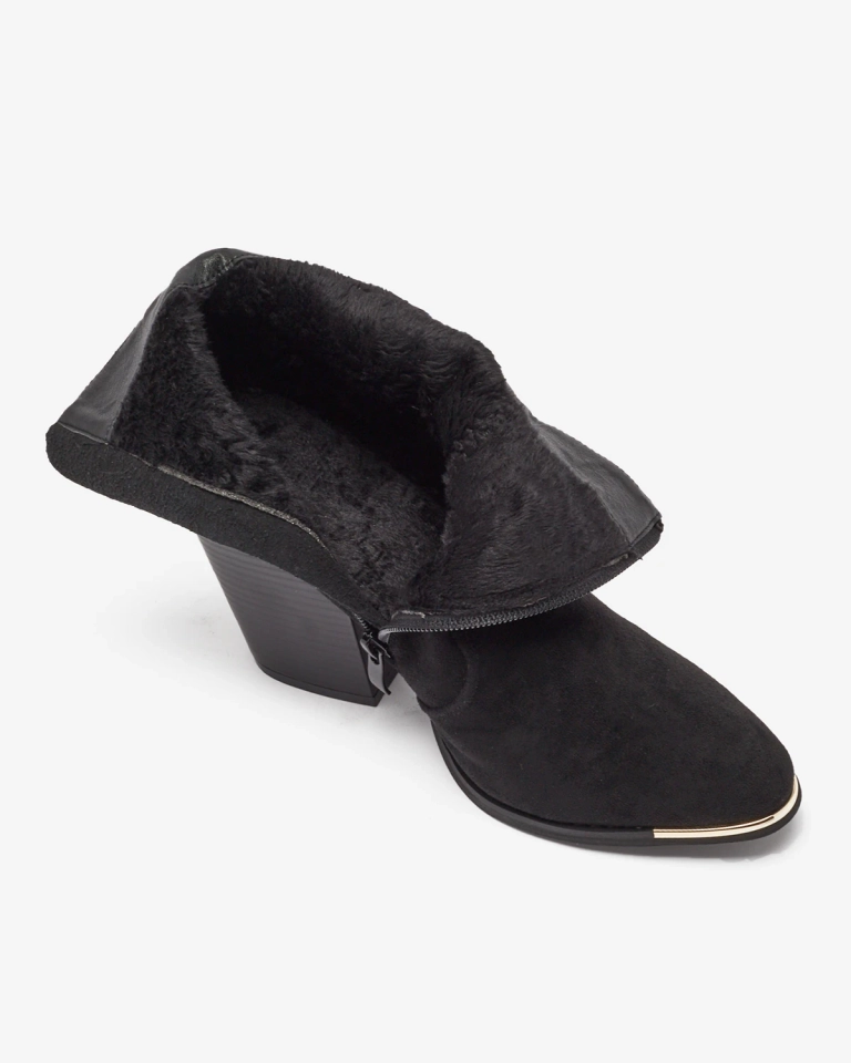 - Klassischer Damenstiefel zum Hineinschlüpfen auf einem stabilen Pfosten mit mandelförmiger Schuhspitze. Das Material des Schaftes ist Öko-Wildleder, die Mitte ist mit weichem Fell isoliert. Eine perfekte Basis für viele Alltagslooks! WOMEN'S DIVA CHARMS H