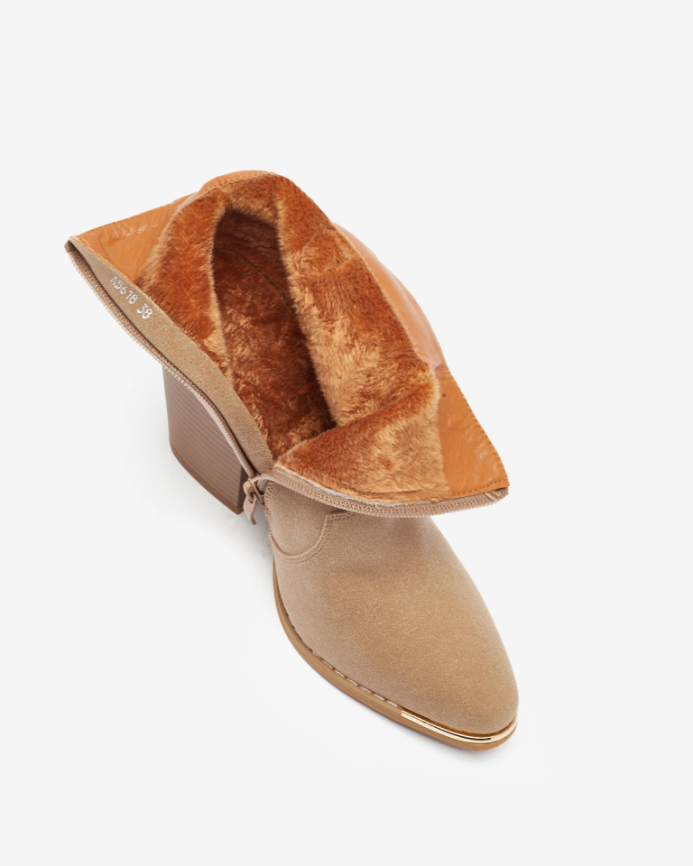 • Klassischer Damenstiefel zum Hineinschlüpfen auf einem stabilen Pfosten mit mandelförmiger Schuhspitze. Das Material des Schaftes ist Öko-Wildleder, die Mitte ist mit weichem Fell isoliert. Eine perfekte Basis für viele Alltagslooks! WOMEN'S DIVA CHARMS H