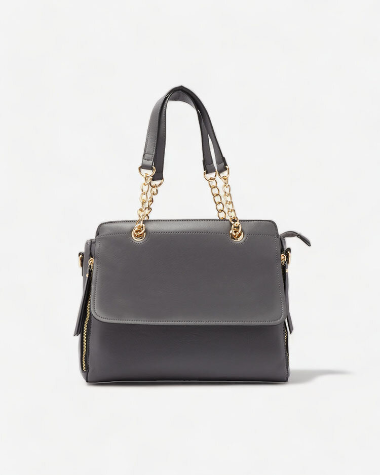 - Klassische Damenhandtasche aus Ökoleder mit Kettengriffen und abnehmbarem Riemen. Die Handtasche mit einem Innenraum aus Stoff, mit Reißverschluss, hat 2 Fächer und 5 Taschen. Die Reißverschlüsse auf der Vorderseite sind dekorativ.