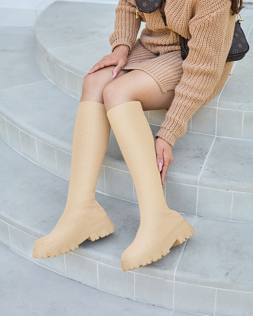 • Einzigartige knielange Damenstiefel aus Stoff. Schlupfstiefel aus elastischem Stoff, der mit einem interessanten Muster verziert ist, das ihnen Stil verleiht. Innen gibt es eine Innensohle aus Stoff. Ein Hit dieser Saison!