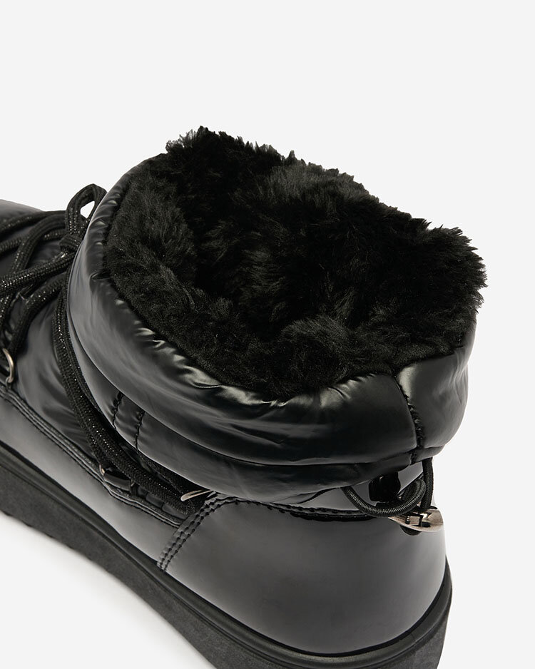 - Damen-Schneestiefel mit einem Obermaterial aus einer Kombination aus Öko-Lackleder und a'la Wachstuchmaterial. Innen isoliert in Form von Pelz, Schlupfschuhe. Das Modell hat einen Rahmen am Ende des Schaftes. Ideal für den Winter!