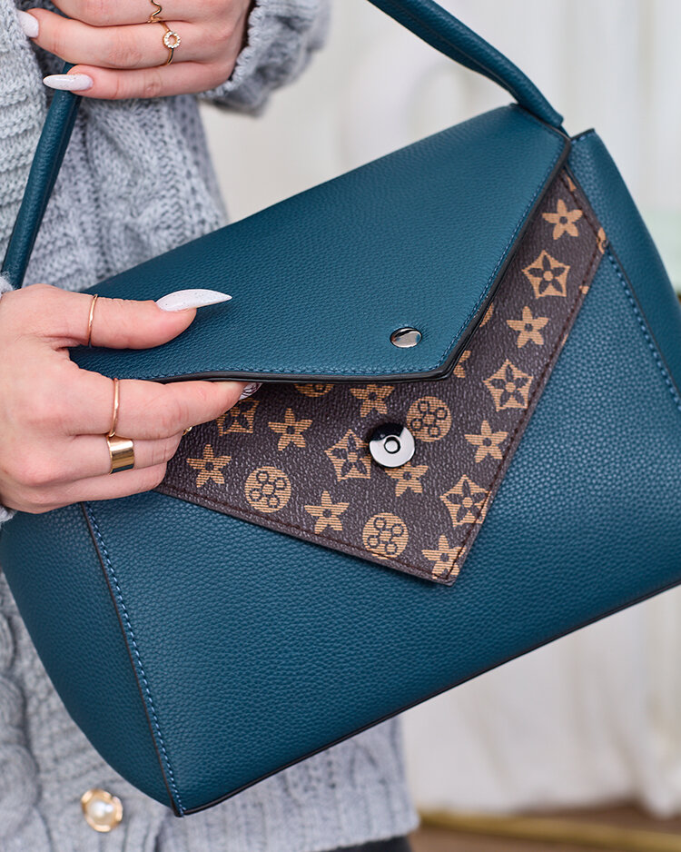 - Kleine Damenhandtasche aus Öko-Leder mit einem gemusterten Einsatz im vorderen Teil. Das Modell wird mit einem Druckknopf und einem Reißverschluss verschlossen. Innen 1 Fach und 3 kleine Taschen.