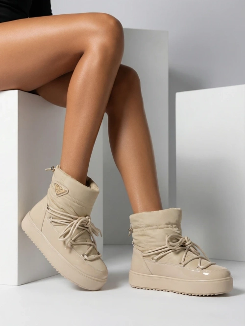 - Damen-Schneestiefel mit einem Obermaterial aus einer Kombination aus Öko-Lackleder und a'la Wachstuch. Innen isoliert in Form von Pelz, Schlupfschuhe. Das Modell hat einen Rahmen am Ende des Schaftes. Ideal für den Winter!