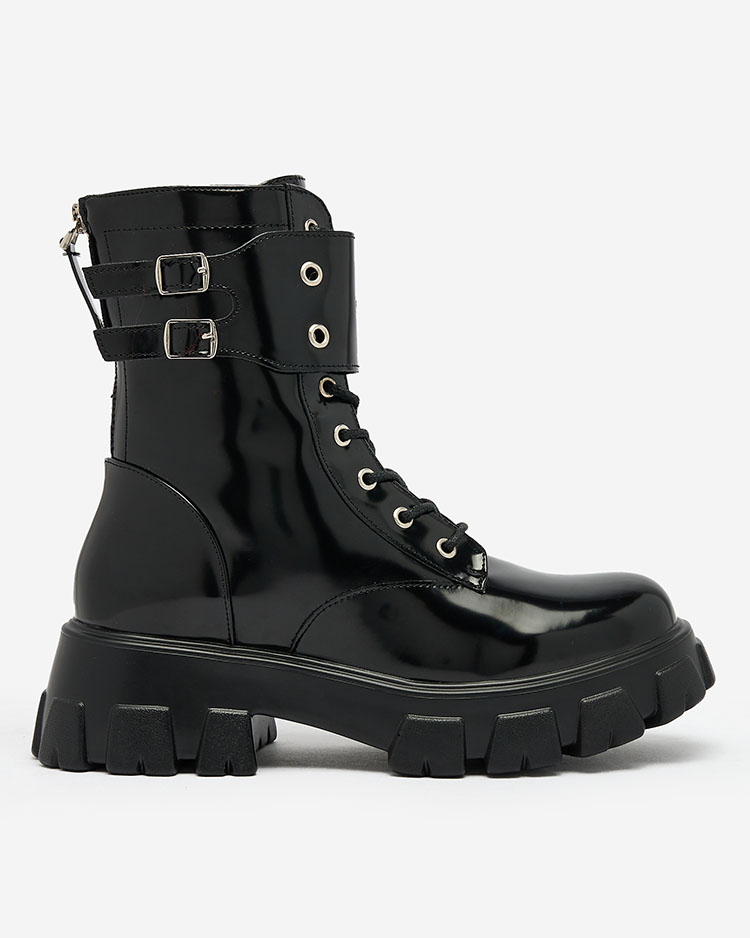 - Damen Baggerstiefel sind einzigartige Schuhe, die Stil und Komfort verbinden. Sie sind aus lackiertem ökologischem Leder gefertigt und innen mit weichem Fell isoliert. Sie haben eine Schnürung und einen Reißverschluss. Die dickere Sohle verleiht den Schuh