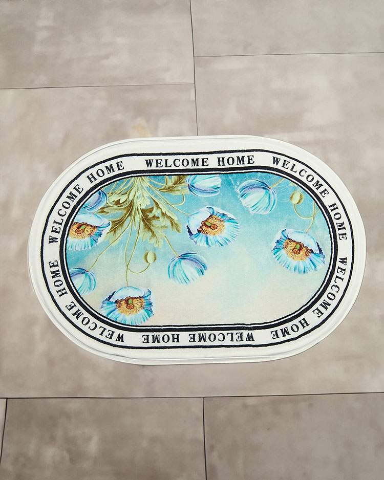 - Kleiner bunter Fußabtreter mit kurzem Flor und der Aufschrift "Welcome Home". Er ist weich und zart, wodurch er sich sehr angenehm anfühlt. Ein weiterer Vorteil des Teppichs ist seine rutschfeste Unterseite.