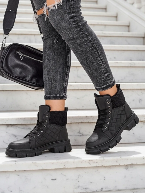 - Zeitlose Damenstiefel a'la Trapper. Der Schaft zum Schnüren ist aus mattem Öko-Leder gefertigt, die Mitte ist mit weichem Fell isoliert. Das Modell ist mit einem gesteppten Einsatz und Schafsfell verziert. Super Ergänzung zu Ihren Winteroutfits!