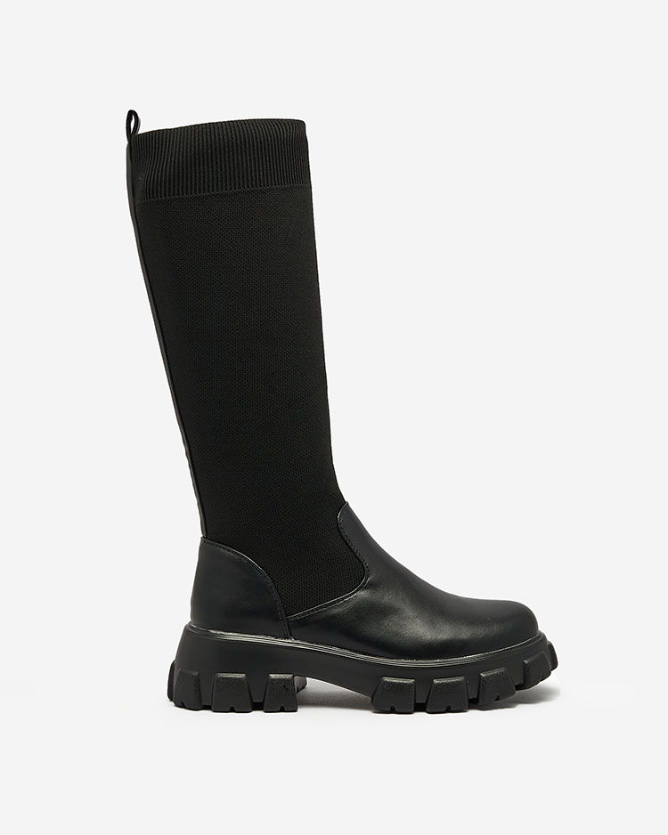 - Stylische Overknee-Stiefel für Damen mit dickerer Sohle. Das Obermaterial ist aus elastischem, geripptem Stoff und hat Einsätze aus Ökoleder. Innensohle aus Stoff. Modell zum Hineinschlüpfen.