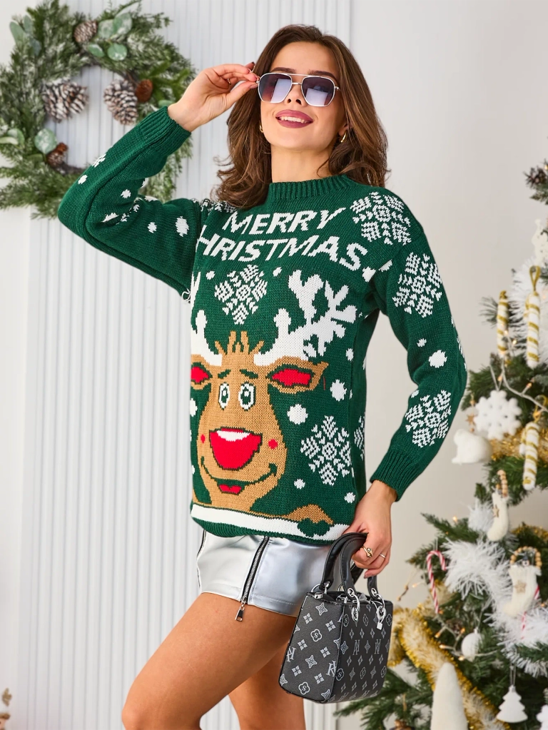 Royalfashion Dunkelgrüner Damen-Weihnachtspullover mit Rentier