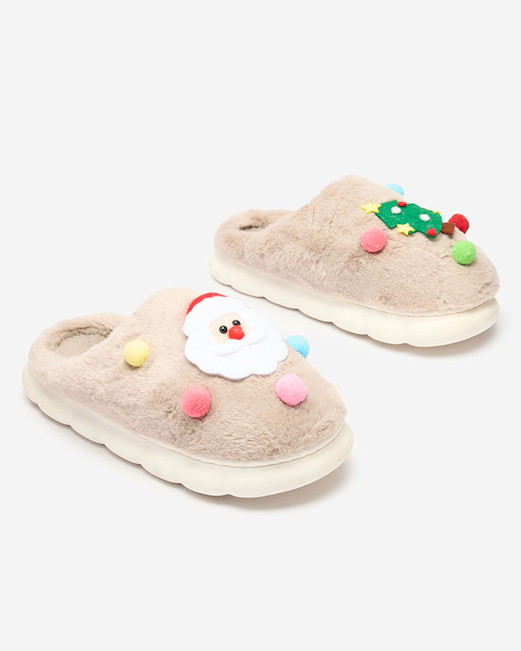 - Niedliche Damenpantoffeln mit flacher Sohle, verziert mit Weihnachtsflicken. Das Modell ist aus pelzimitierendem Material gefertigt. Eine tolle Option für das Outfit zu Hause!