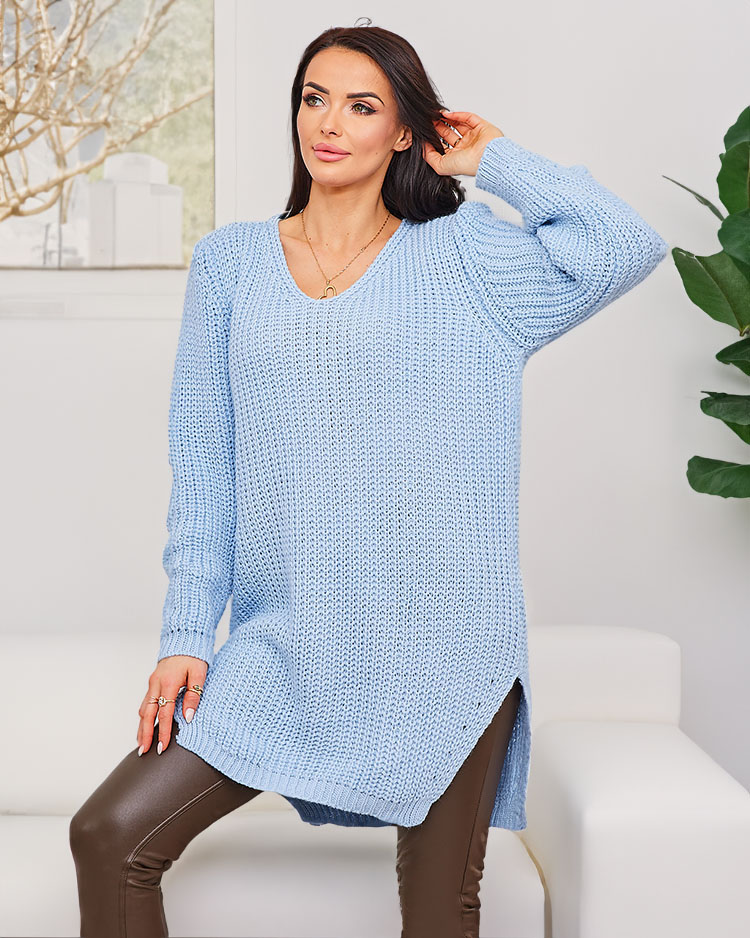 - Längerer Damenpullover aus weichem Strickstoff, der Pullover hat einen Herzausschnitt und lange Ärmel. Die Borte verleiht ihm einen originellen Stil!