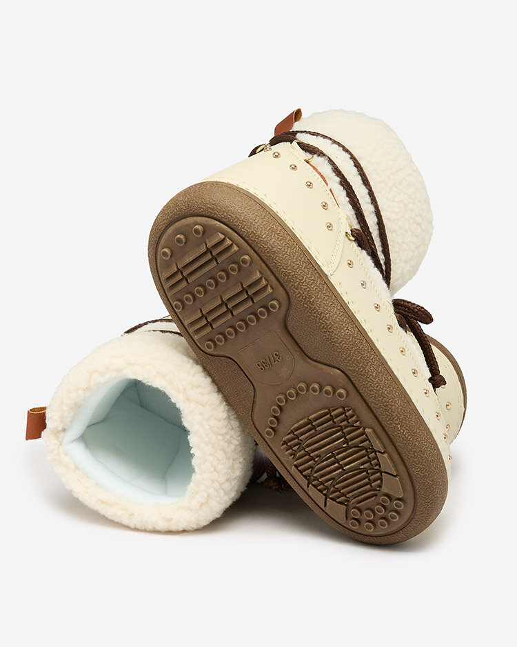 - Warmer Damen Winterschneestiefel mit flacher Sohle. Schaft zum Schnüren, aus einer Kombination von Ökoleder und Schafsfell. Isolierung in Form von Schaumstoff. Die perfekte Basis für den Winter!
