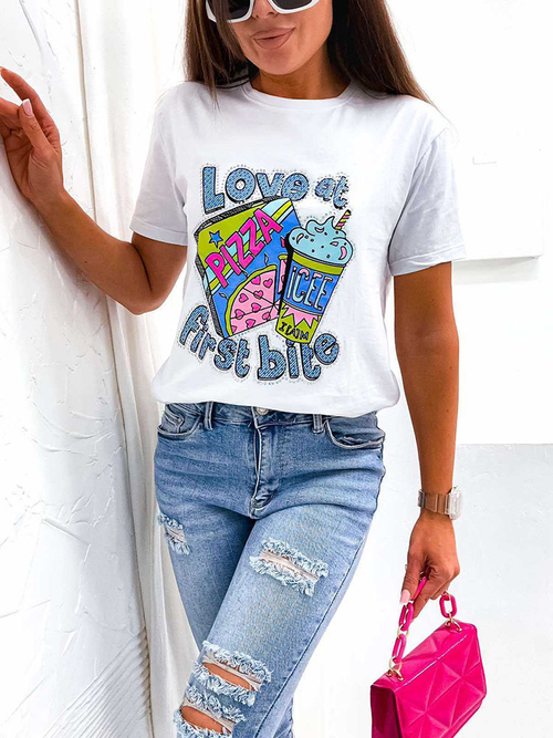 - Lässiges bedrucktes Damen-T-Shirt mit kurzen Ärmeln. Hergestellt aus Baumwollstoff. Perfekte Basis für viele Alltagslooks! HINWEIS: Messgenauigkeit (+/-) 1 cm. Abmessungen flach gemessen.
