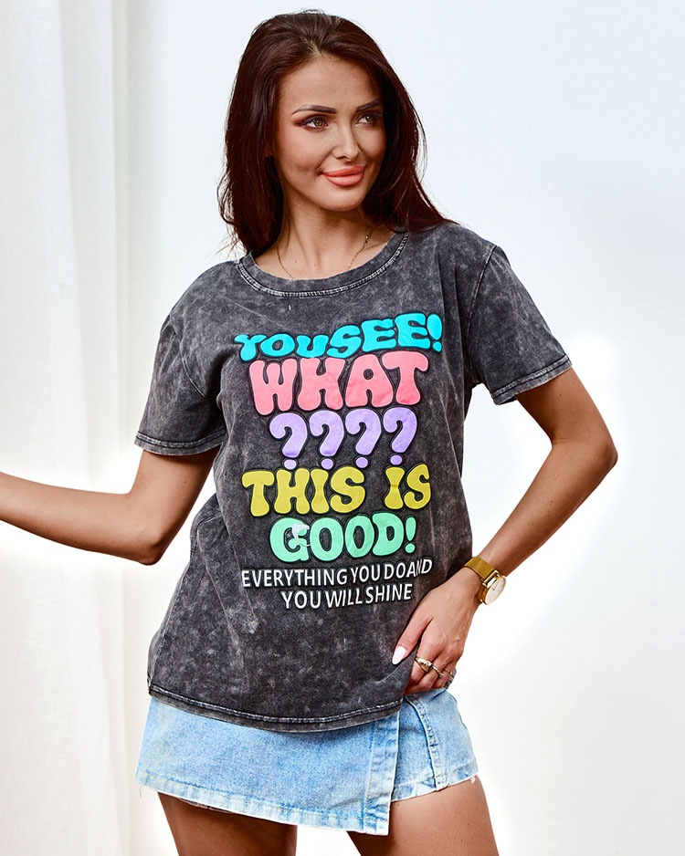 - Lässiges bedrucktes Damen-T-Shirt mit kurzen Ärmeln. Hergestellt aus Baumwollstoff. Perfekte Basis für viele Alltagslooks! HINWEIS: Messgenauigkeit (+/-) 1 cm. Abmessungen flach gemessen.