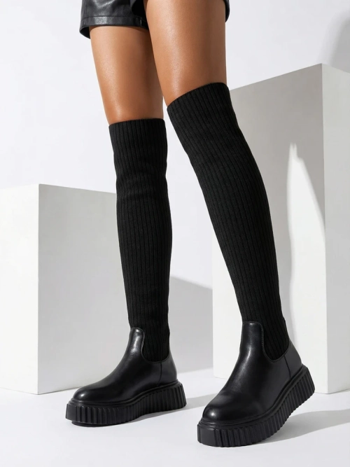 • Stylische Damenstiefel mit dickerer Sohle. Der Schaft ist aus elastischem, geripptem Stoff und hat Einsätze aus Ökoleder. Innensohle aus Pelz. Modell zum Hineinschlüpfen.