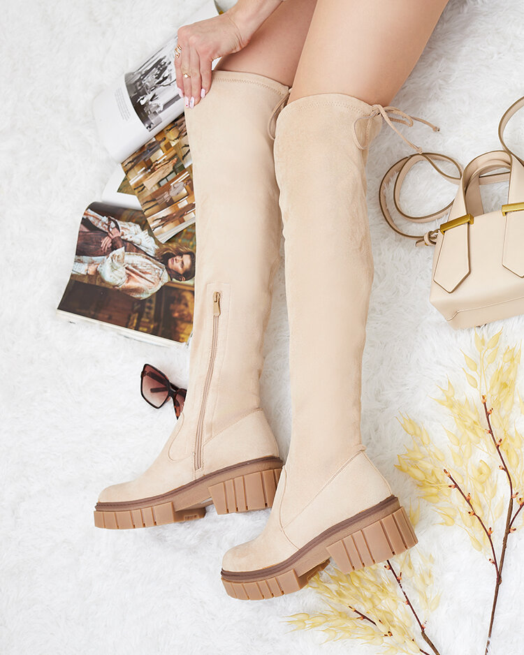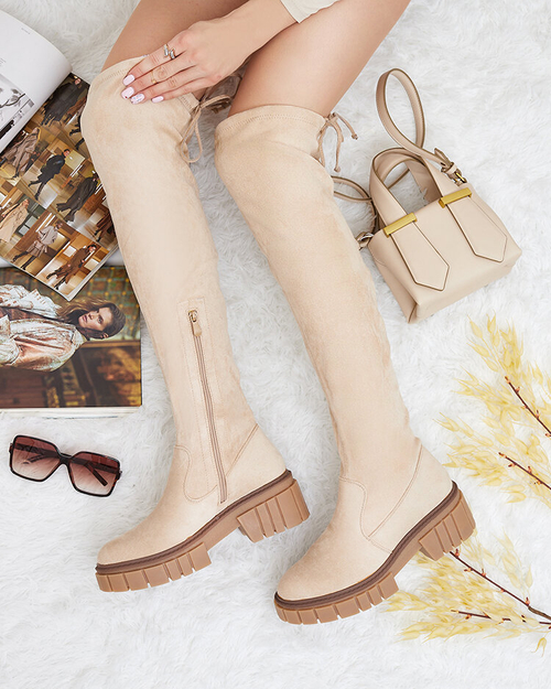- Langer Damenstiefel mit dickerer Sohle, Schaft aus Öko-Wildleder. Das Modell hat eine Innensohle aus Pelz. Die Stiefel haben einen Reißverschluss in der Mitte der Wade und sind mit einem Rahmen versehen. Perfekte Basis für viele Winteroutfits!
