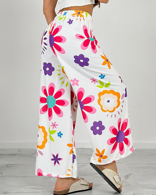 - Weite Hose mit Blumenmuster. Modell mit mittlerer Taille, mit Gummizug und Bindebändern in der Taille, hat Taschen auf der Vorderseite. Mode und Komfort in einem!