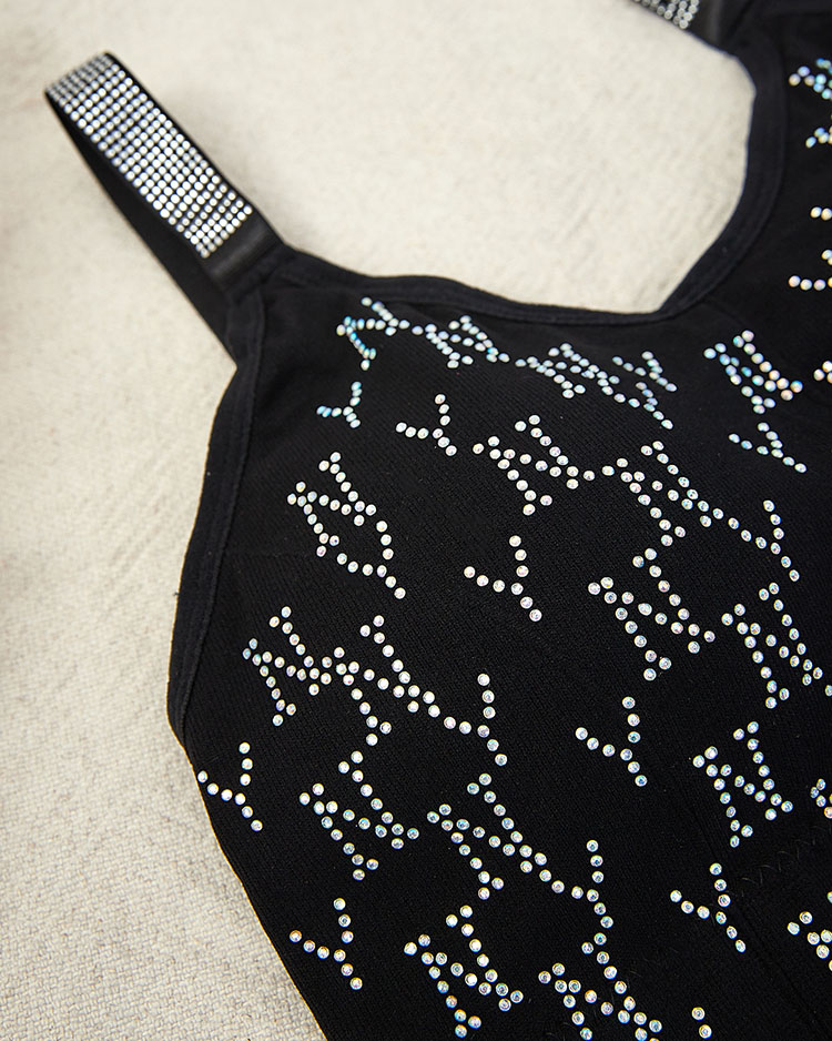 • Damen Sport-BH aus elastischem, angenehmem Material. Modell mit verstellbaren Trägern, ohne Verschluss und mit herausnehmbaren Einsätzen, unten mit breitem Gummizug abgeschlossen und mit Zirkonen verziert. Sie können es auch als Oberteil tragen!