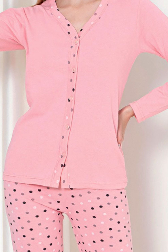 • Damen Schlafanzug 2-teilig aus Baumwollstoff mit dekorativem Druck. Das Set besteht aus einer Bluse mit langen Ärmeln und einer Hose mit elastischem Bund und geradem Bein.