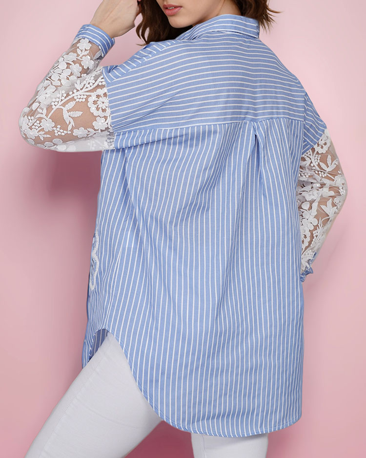 - Damenshirt mit langen Spitzenärmeln, verziert mit einem Streifenmuster. Außerdem ein glänzender Aufnäher. Das Modell ist geknöpft. Ein Muss im Kleiderschrank einer jeden Frau!