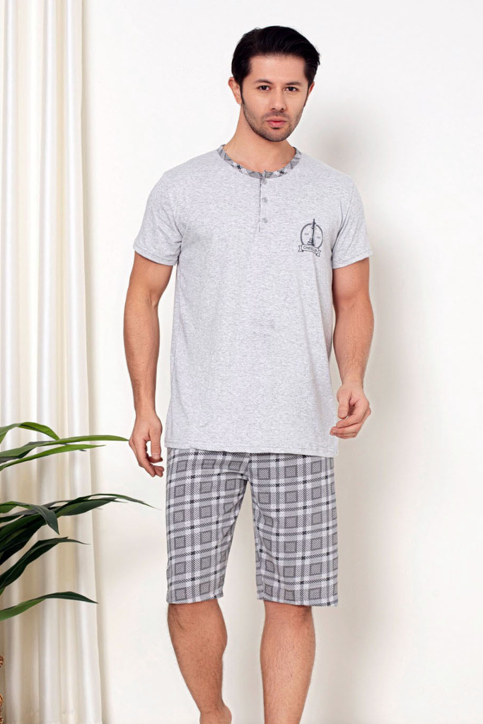 - Bequemer zweiteiliger Schlafanzug für Männer mit kurzen Ärmeln und kurzen Beinen aus Baumwollstoff. Das Modell ist mit einem Druck verziert. Perfekt für den Abend zu Hause! HINWEIS: Messgenauigkeit (+/-) 1 cm.