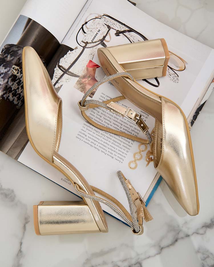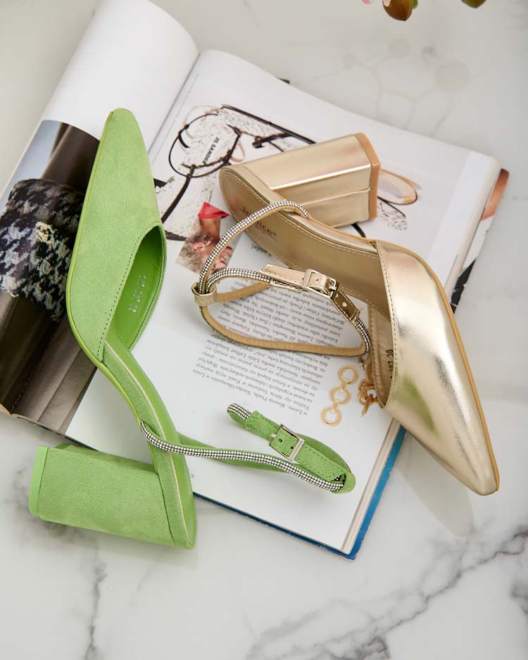 - Sandalen a'la Pumps auf einem Pfosten aus Öko-Leder und Öko-Leder-Innensohle, die mit einer Paillettenschnalle geschlossen werden. Die Sandaletten sind auf einem bequemen Pfosten, der viel mehr Komfort bietet, und die Schnalle macht das Anziehen einfacher
