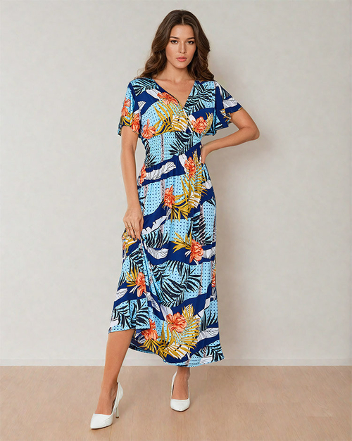 - Ein einzigartiges Damenkleid aus leichtem Stoff. Produkt von Midi-Länge, mit kurzen Ärmeln und einem Herzausschnitt. Das Modell ist mit einem Aufdruck verziert. Fühlen Sie den Sommer in diesem Modell!