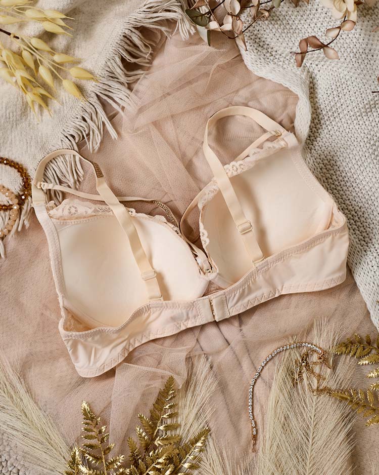 - Außergewöhnlicher gepolsterter Damen-BH. Die dezente Verarbeitung mit zarter Spitze verleiht ihm eine besondere Eleganz. Das Produkt wird auf der Rückseite mit Haken geschlossen. Die Träger sind abnehmbar und verstellbar. Das Modell hat dekorative Träger