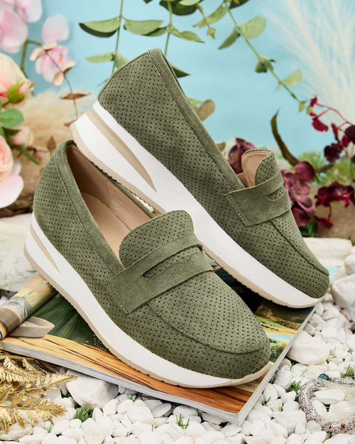• Schöne Damen Mokassin Halbschuhe mit niedrigen Absätzen. Modell in einem lässigen Stil und ist aus Bio-Wildleder und natürlichem Leder Innensohle gemacht. Abgerundete Nase. Perfekte Basis für viele Alltagslooks!