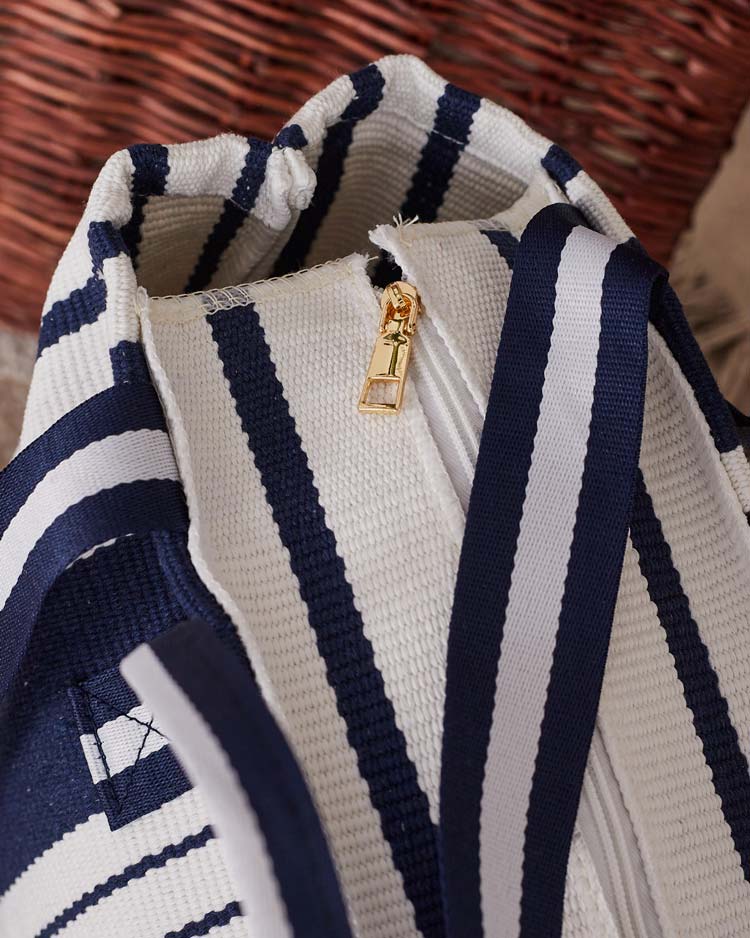 - Große Damentasche aus Stoff mit Streifenmuster. Das Modell hat 1 Fach und ist mit einem Reißverschluss versehen. Perfekt für jeden Tag oder für den Strand!
