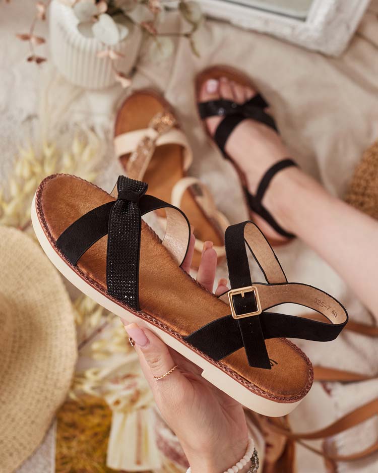 - Die flachen Damensandalen haben Riemen aus Ökoleder und eine Innensohle aus Ökoleder. Die vorgestellten Damenschuhe werden mit einer Schnalle geschlossen und sind mit Zirkonen verziert. Sie passen sich dem Fuß gut an!
